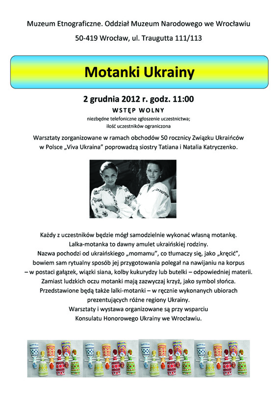 Warsztaty zorganizowane w ramach obchodów 50 rocznicy Związku Ukraińców w Polsce „Viva Ukraina” poprowadzą siostry Tatiana i Natalia Katryczenko; każdy z uczestników będzie mógł samodzielnie wykonać własną motankę. Lalka – motanka to dawny amulet ukraińskiej rodziny. Nazwa pochodzi od ukraińskiego „momamu”, co tłumaczy się, jako „kręcić”, bowiem sam rytualny sposób przygotowania tej lalki polegał na nawijaniu na jej korpus – w postaci gałązek, wiązki siana, kolby kukurydzy lub butelki – odpowiedniej materii. Zamiast ludzkich oczu motanki mają zazwyczaj krzyż, jako symbol słońca. Przedstawione będą także lalki – motanki – w ręcznie wykonanych ubiorach prezentujących różne regiony Ukrainy. Warsztaty i wystawa organizowane są przy wsparciu Konsulatu Honorowego Ukrainy we Wrocławiu. Zapraszamy na godz. 11 00. WSTĘP WOLNY
