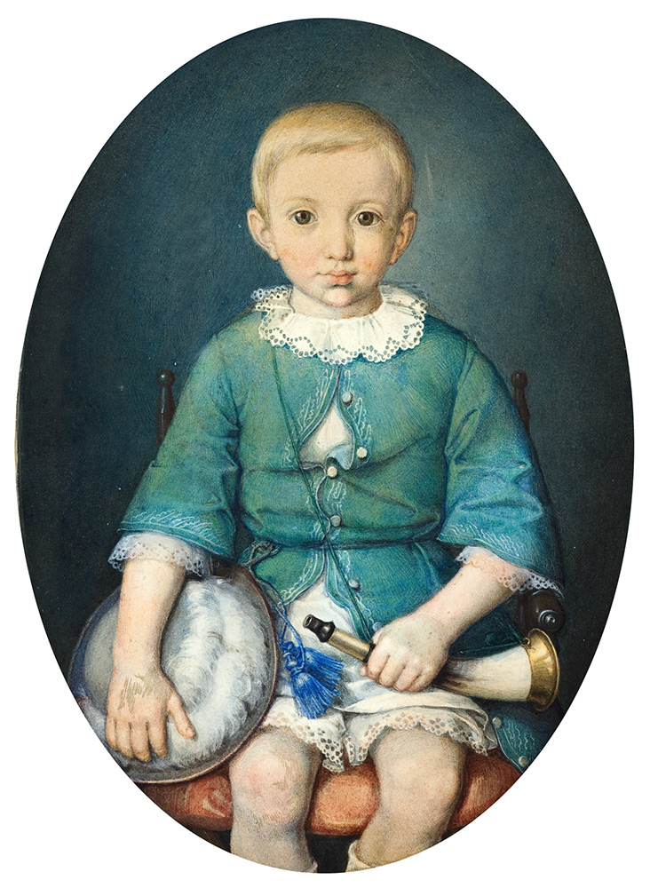 Chłopiec przedstawiony na akwareli to Antoni Serafiński (1853–1905), przyszły adwokat i burmistrz Bochni. Zwany w rodzinie Tosiem, uwieczniony został przez Jana Matejkę (1838–1893) w wieku około czterech lat. Na ramieniu ma zawieszony myśliwski róg, a prawą ręką trzyma kapelusz z piórami.