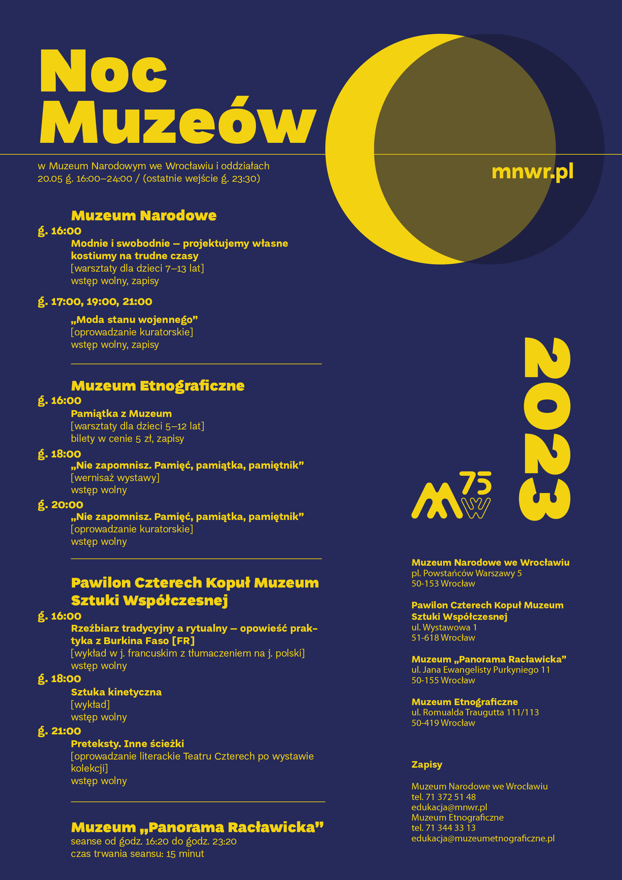 Oprowadzania kuratorskie po wystawie „Moda stanu wojennego” w Muzeum Narodowym, uroczyste otwarcie nowej wystawy czasowej „Nie zapomnisz. Pamięć, pamiątka, pamiętnik” w Muzeum Etnograficznym oraz oprowadzanie literackie Teatru Czterech w Pawilonie Czterech Kopuł – to niektóre z wydarzeń zaplanowanych na Noc Muzeów przez Muzeum Narodowe we Wrocławiu i jego oddziały.