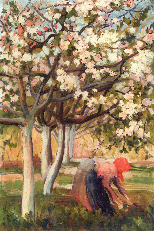 „Rząd kwitnących drzewek – może wiśni lub jabłoni – zieleń trawy, skrawek nieba. Na chwilę przenosimy się prosto do pachnącego sadu. Patrzymy na wiosnę 1904 roku, widzianą oczami pewnej młodej malarki”…