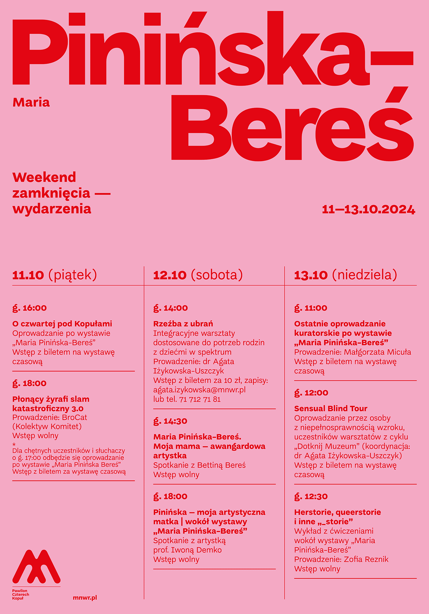 Zaplanowano slam poetycki i „Sensual Blind Tour” – niecodzienne oprowadzanie przygotowane przez osoby z niepełnosprawnością wzroku, w którym można uczestniczyć z zakrytymi oczami. Odbędą się też warsztaty szycia rzeźby i tańca intuicyjnego. W programie także wykłady, m.in. o socjalistycznej rewolucji obyczajowej, o performatywnym obliczu artystki czy o Marii Pinińskiej-Bereś oczami jej córki Bettiny.