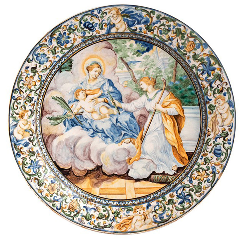 Pośród gorliwych wyznawców św. Martyny był słynny Pietro Berretini da Cortona, architekt, dyrektor rzymskiej Akademii, także autor projektu nowego kościoła. Wyjątkowo skrupulatnie zatem nadzorował Cortona prace i wspierał finansowo wyposażanie świątyni. Kilkakrotnie malował wizerunki admirowanej świętej dziewicy, w różnych ujęciach: w scenach mąk lub wzniosłych adoracji. Echem jednej z takich prac (obraz dzisiaj w kolekcji Banca Cariage w Genui) jest piękna scena na talerzu muzealnym. Echem, bowiem w rzeczywistości źródłem dla ceramika była grafika, miedzioryt Giovanniego Battisty Bonanciny – autorska wersja, nie kopia olejnego oryginału.