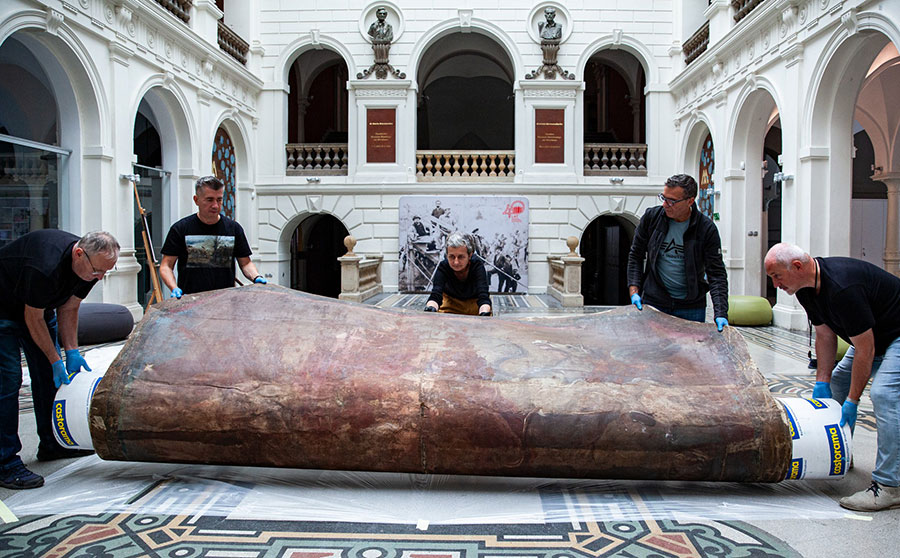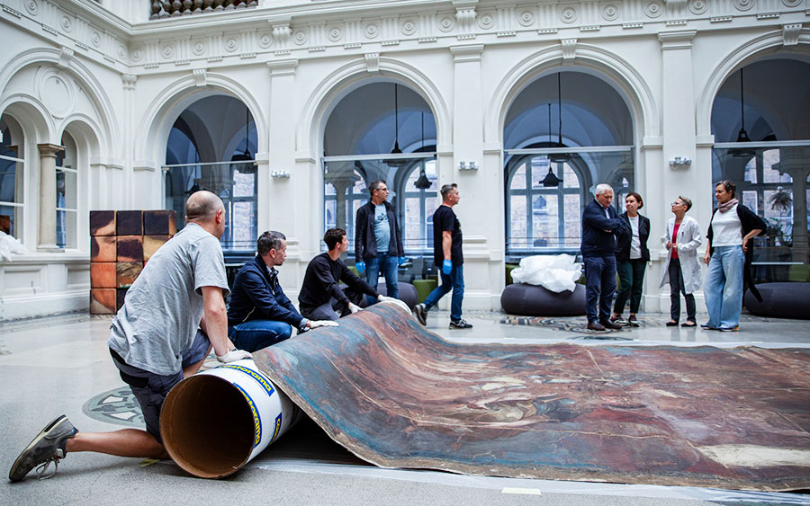 Konserwacja obrazu potrwa. Firma REARTE s.c., która podjęła się ratowania dzieła blisko 10 lat temu, skutecznie przywróciła świetność innego wielkoformatowego obrazu olejnego z kolekcji MNWr autorstwa Wilhelma von Lindenschmita pt. Alaryk w Rzymie z 1886 r. Dziś wspaniale prezentuje się w Zamku Książ. Prace konserwatorskie plafonu z Brzezinki prowadzone będą pod nadzorem Pracowni Konserwacji Malarstwa Muzeum Narodowego we Wrocławiu. Będziemy na bieżąco informować o postępach tej konserwacji.