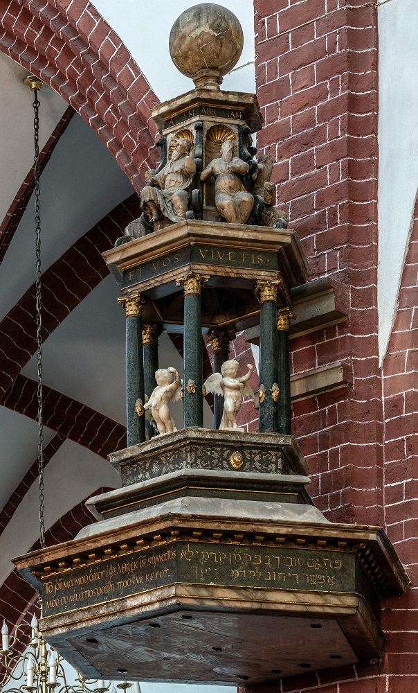 Autorem tego dzieła był tutejszy mistrz rzeźbiarski i architekt Friedrich Gross st. (ok. 1540–1589). Pracował nad nią przez trzy lata (od 1579 r.), ale jeszcze w momencie konsekracji, w wigilię roku 1581 nie mógł uznać, że dzieło jest kompletne. Dopiero w 1583 r. pastor Lucas Polio ogłosił podczas uroczystego nabożeństwa, że dzieło zostało ukończone – wówczas to umieszczono w drzwiczkach ambony wspaniałą ażurową bramkę z pozłacanego brązu.