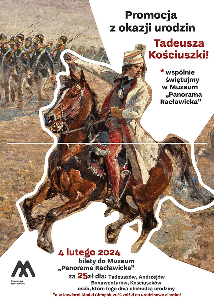 4 lutego przypadają urodziny Tadeusza Kościuszki (rocznik 1746)! Z tego okazji w najbliższą niedzielę na wszystkich Tadeuszów, Andrzejów, Bonawenturów, a także osoby, które mają na nazwisko Kościuszko, oraz te, które obchodzą w tym dniu urodziny, czeka promocja – bilet do Muzeum „Panorama Racławicka” w zniżkowej cenie 25 zł!