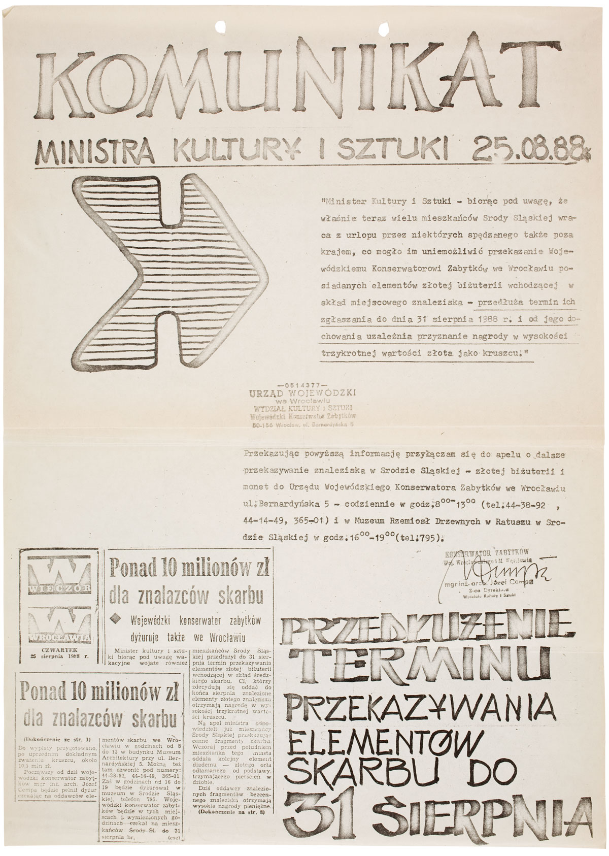 Pokłosiem tych działań była publikacja pierwszego całościowego opracowania Skarbu Średzkiego, które ukazało się w 1996 roku. Skarb został wówczas przekazany decyzją Ministra Kultury do zbiorów Muzeum Narodowego we Wrocławiu i tu właśnie zorganizowano jego premierową wystawę.