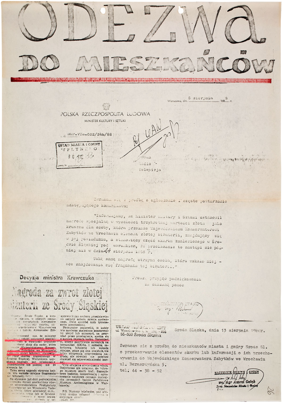 Prawie trzy lata później, 24 maja 1988 roku, podczas kontynuowania prac budowlanych wydobyto wraz z fragmentami uszkodzonego ceglanego muru złote i srebrne monety oraz odłamki glinianych naczyń. Tajemniczy złoty skarb, wkrótce nazwany Skarbem Tysiąclecia, stał się natychmiast sensacją prasową.