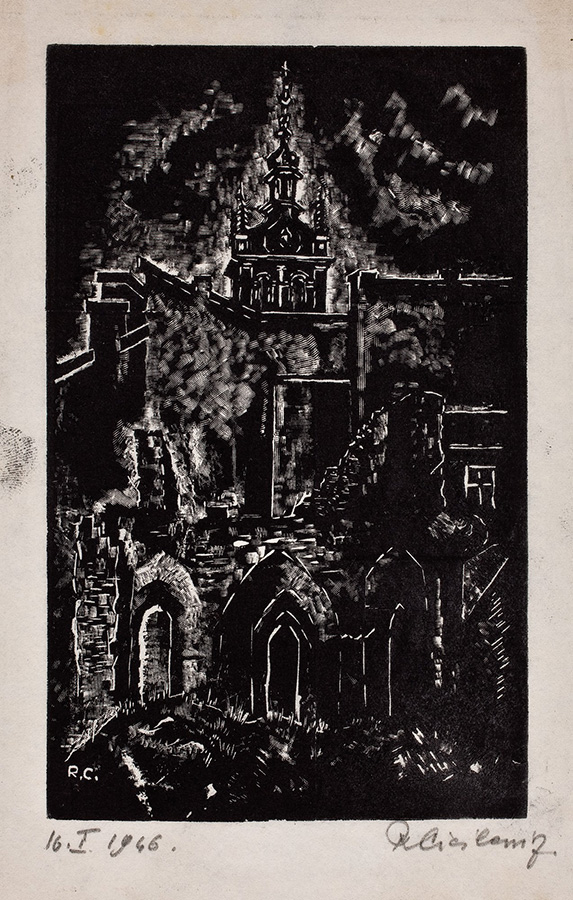 Wśród dzieł znajdujących się w zbiorach Muzeum Narodowego we Wrocławiu jest także jedna z najstarszych zachowanych prac Cieślewicza. Jest to niewielkich rozmiarów grafika (18 × 12,5 cm) wykonana w technice drzeworytu sztorcowego, którą stworzył kilka dni po swoich szesnastych urodzinach. Praca przedstawia pejzaż architektoniczny. Zza budynków ukazanych na pierwszym planie wyłania się perła lwowskiej architektury – słynna wieża Korniakta (od nazwiska fundatora, lwowskiego patrycjusza Konstantego Korniakta), należąca do zespołu cerkwi Zaśnięcia Matki Bożej, zwanego cerkwią Wołoską.