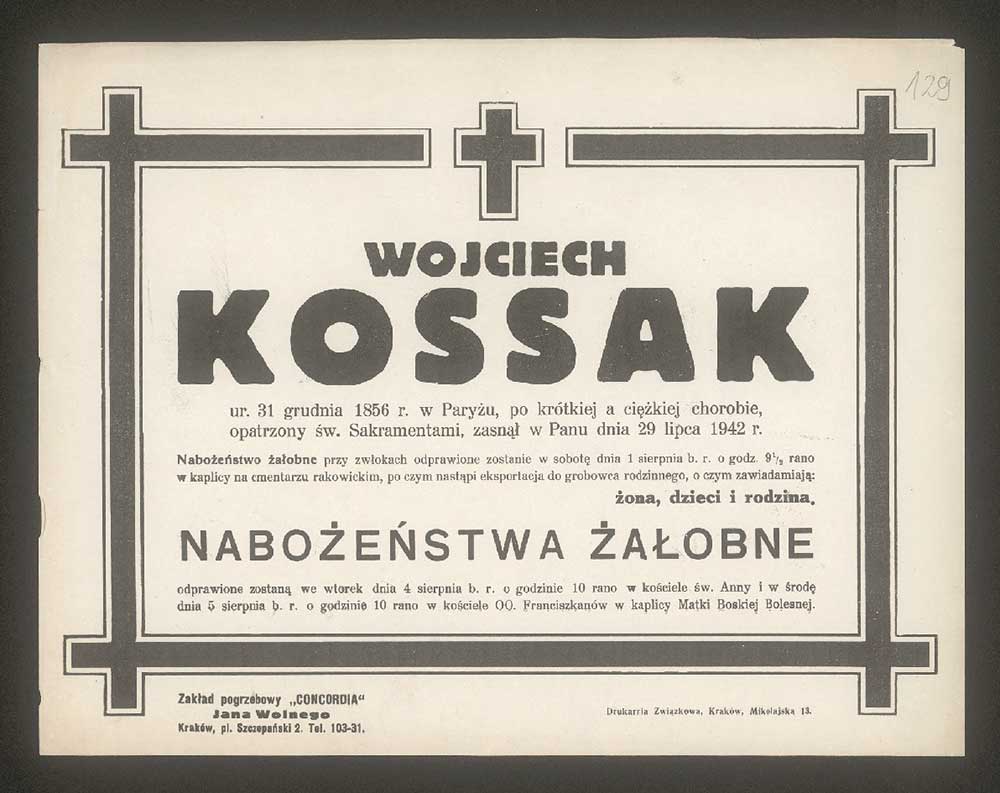 29 lipca 1942 zmarł Wojciech Kossak. Artysta ostatnie lata życia spędził w Krakowie. Za jego obrazy niemieccy okupanci oferowali spore sumy. Kossak odmawiał.