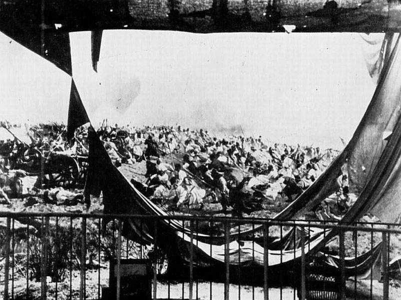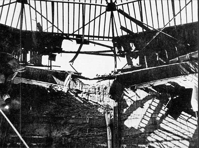 W nocy z 9 na 10 kwietnia 1944, podczas pierwszego wielkiego sowieckiego nalotu na Lwów, kilka bomb uszkodziło rotundę, która sąsiadowała z niemieckimi składami amunicji na terenach powystawowych. Malowidło uległo znacznemu uszkodzeniu. Fragment płótna oberwał się i spadł na sztuczny teren. W wielu miejscach obraz został przedziurawiony.