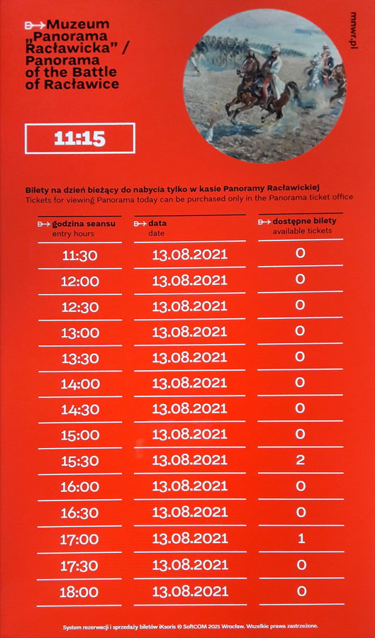 Szanowni Państwo, na prośbę obsługi Muzeum informujemy, że wyświetlacz przy kasie działa poprawnie, powtarzające się zero przy dostępnej licznie biletów nie jest oznaką błędu systemu, lecz potwierdzeniem, że wszystkie bilety na daną godzinę zostały wyprzedane. Z uwagi na obostrzenia epidemiologiczne nie ma możliwości zwiększenia limitu dostępnych miejsc. Prosimy o zrozumienie i polecamy zakup biletów z wyprzedzeniem w systemie online.