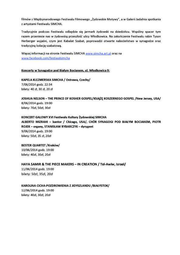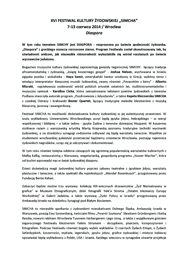 W dniach 7-13 czerwca zapraszamy na XVI Festiwal Kultury Żydowskiej SIMCHA.