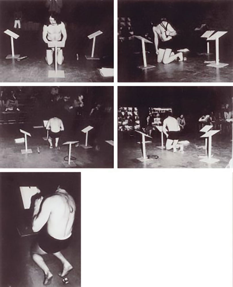 Artysta wykonał cztery odczyty, każdy w pozycji klęczącej, którym towarzyszyły różne narzędzia: guma, powróz, pałka i nahaj. Kulminacją performance’u była scena symboliczna – na przecięciu osi „filozofia-historia” i „personalizm-socjalizm” artysta wypił szklankę wody i oddał mocz, domykając w ten sposób wielowarstwową refleksję nad ciałem, systemem i wolnością.