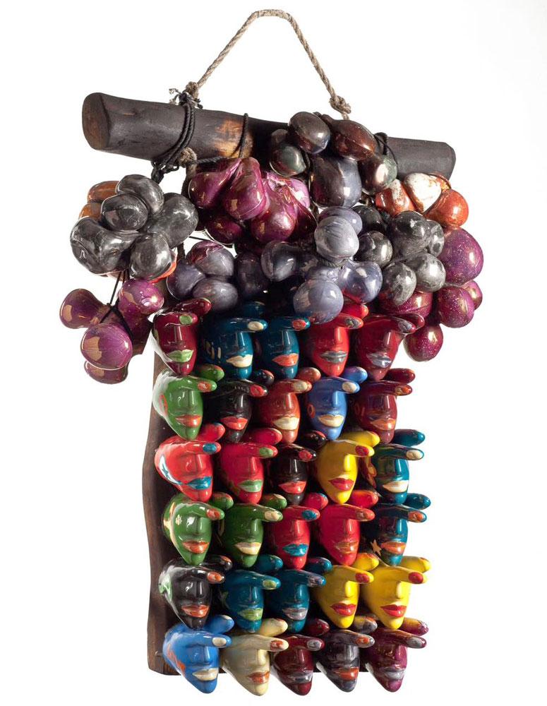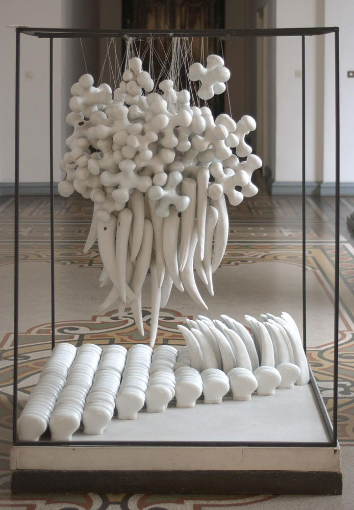 W kolejnych wariantach porcelanowych chmur łączyła surowe ceramiczne tworzywo z naturalnymi materiałami – wygładzonymi konarami czy łupinami drzew i konopnym sznurem.